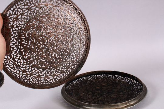 A 19TH CENTURY ISLAMIC SILVERED METAL OPENWORK BOX & COVER, decorated with animals and foliage, with outer borders of calligraphy, 22cm diameter.