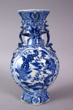A SMALL CHINESE BLUE AND WHITE PORCELAIN VASE, the neck with moulded animal form handles, the body decorated each side with phoenix and dragons, 18cm.