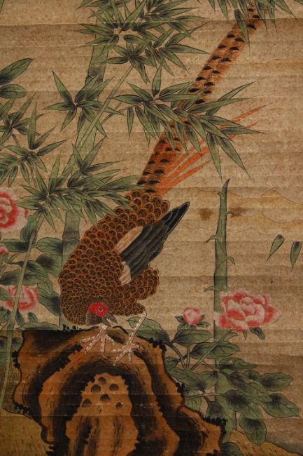 TWO GOOD LARGE CHINESE PAINTED SCROLLS - BIRDS AND PEACOCK, the peacocks stood amongst native flora alongside a stream, signed and sealed, the other depicting birds and craned in native landscape views, signed and sealed (2)