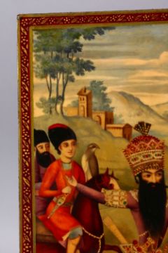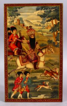 A PERSIAN QAJAR LACQUER PANEL DEPICTING FATH ALI SHAH - 2ND KING OF QAJAR, 29cm x 17cm.