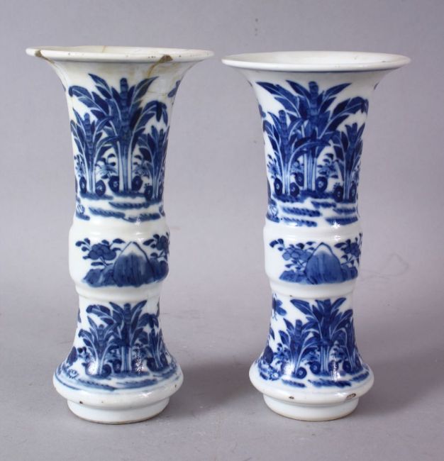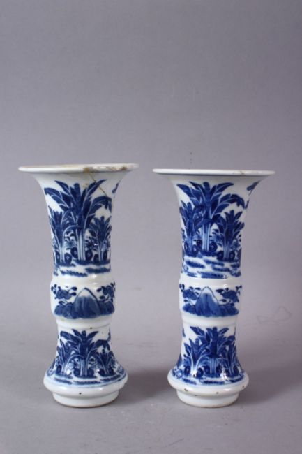 A PAIR OF 19TH CENTURY OR LATER CHINESE BLUE & WHITE PORCELAIN GU VASES, The body of the vases decorated with native landscape views, one AF, 15cm high .
