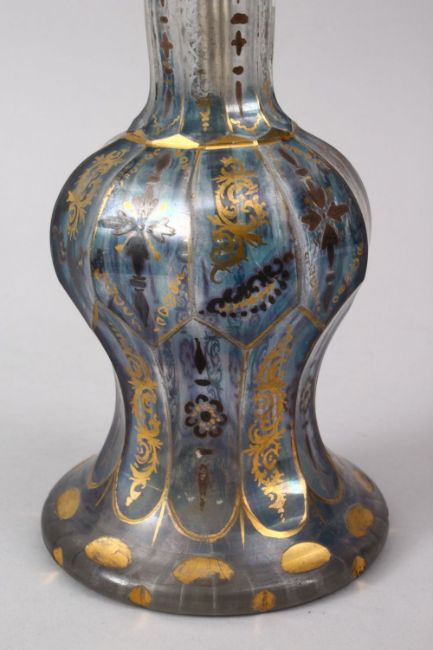 A 19TH CENTURY BOHEMIAN GILT GLASS HUQQA BASE WITH A WHITE METAL TOP, 38cm.