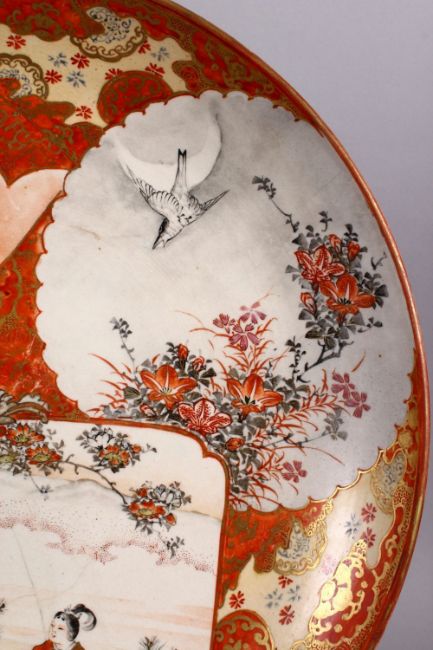 A JAPANESE MEIJI PERIOD KUTANI PORCELAIN CHARGER, with decoration of figures exterior, birds amongst moon, and native floral design, with motif border decoration and gilt highlights upon orange ground, 37cm.