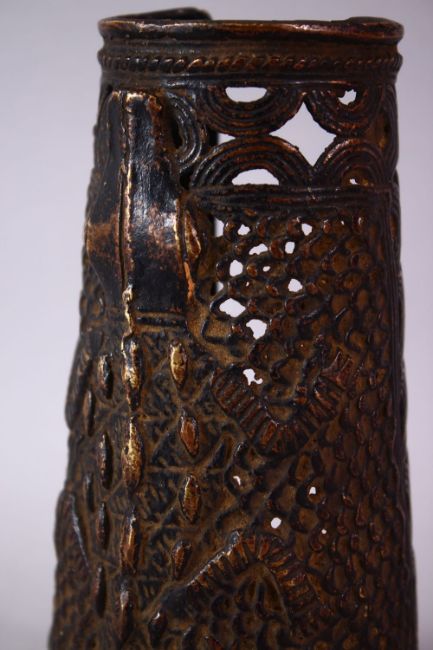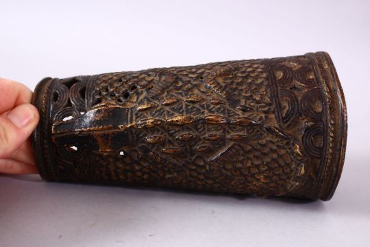 AN UNUSUAL BENIN BRONZE ARM GUARD, relief cast and pierced with a crocodile, 18cm long.