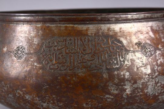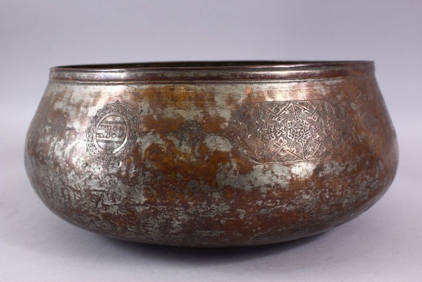 A LARGE 15TH / 16TH CENTURY MAMLUK TINNED COPPER CALLIGRAPHIC BOWL, with panels of calligraphy and flora, 36cm.