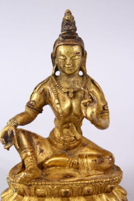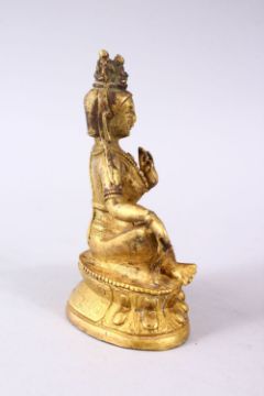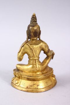 A GOOD CHINESE QING DYNASTY GILT BRONZE FIGURE OF BUDDHA, in a seated position upon a lotus form base, with meditating hands. 11cm high.