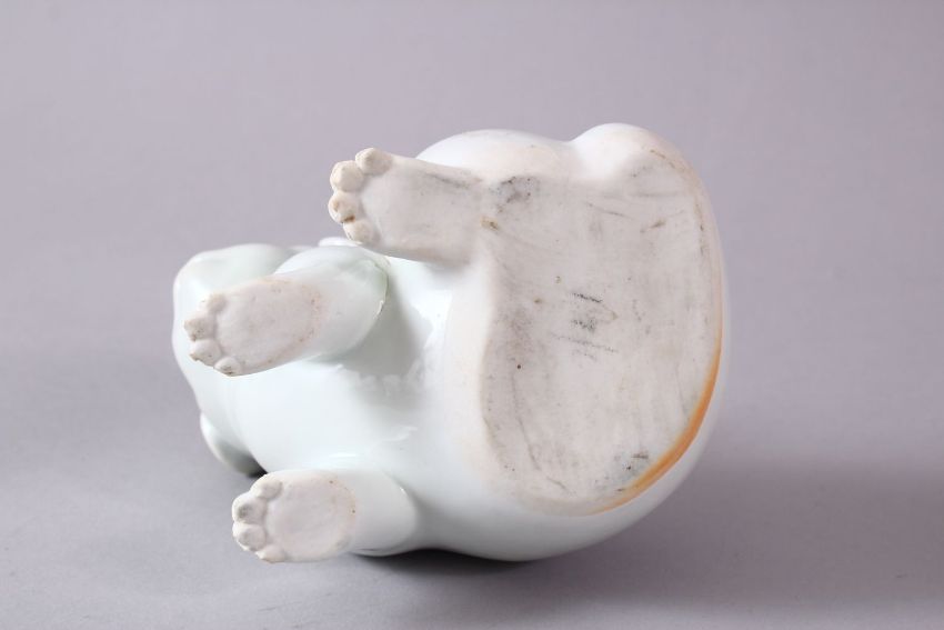 A 19TH CENTURY JAPANESE HIRADO PORCELAIN MODEL OF A PUPPY in a seated pose, 10cm high, 13cm wide.
