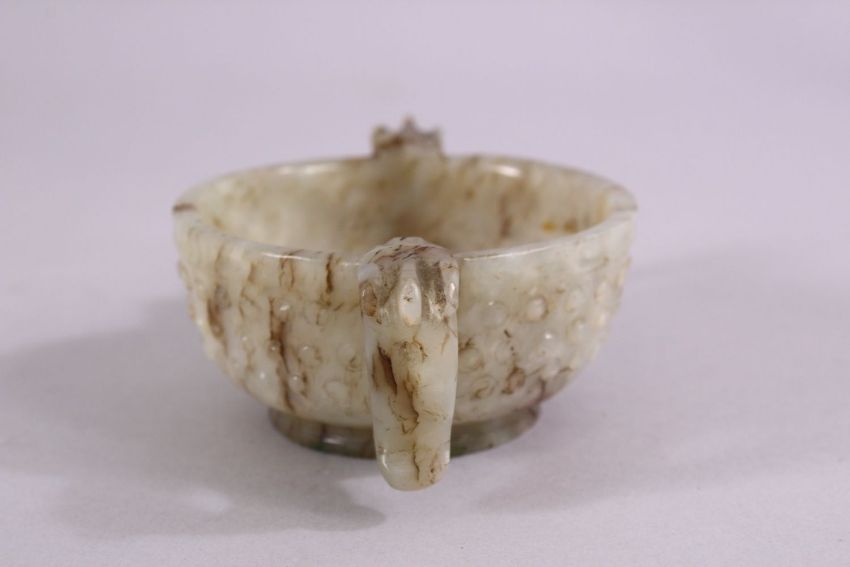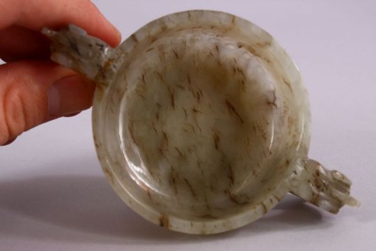 A CHINESE CARVED JADE ARCHAIC STYLE TWIN HANDLE CUP, with chilong handles, and boss decoration, 11cm diameter.