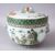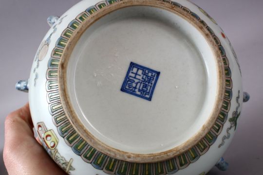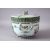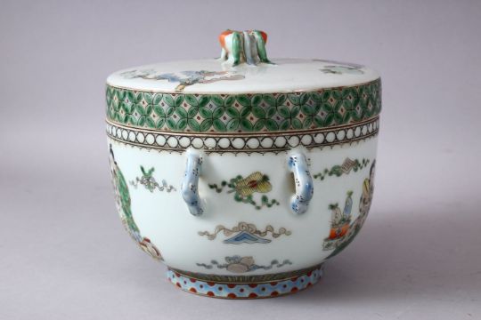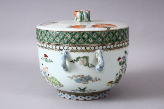 A CHINESE FAMILLE VERTE PORCELAIN BOWL & COVER, decorated with peach fruits, and figures and children seated, surrounded with precious object decoration,, with four moulded handles to the side, the cover with the finial of a spider, the base with a blue seal mark to base, 19cm diameter.
