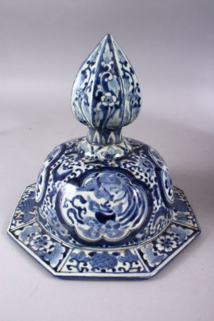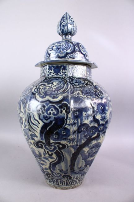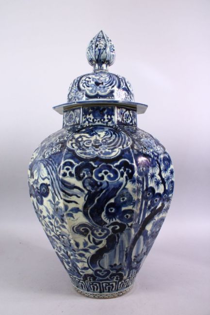 A LARGE EARLY 16TH / 17TH CENTURY JAPANESE BLUE & WHITE IMARI PORCELAIN VASE & COVER, The octagonal form vase with decoration of phoenix birds in landscapes and smaller panel decoration to the lid (restored) 65cm high x 38cm