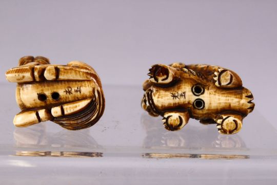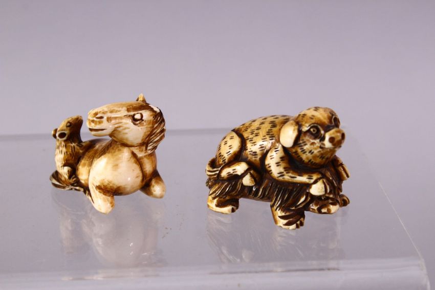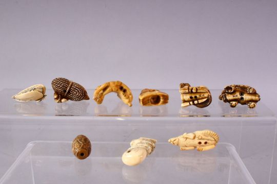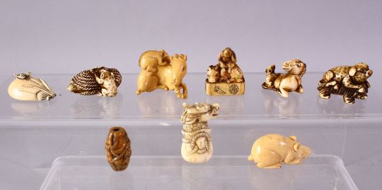 A LOT OF EIGHT JAPANESE MEIJI / EDO PERIOD CARVED IVORY NETSUKE & OJIME, one possibly later edo period depicting a figure upon a recumbent oxen, the remaining seven depicting horses, pig, rats and dragon, with a carved possibly bone ojime bead, (9)
