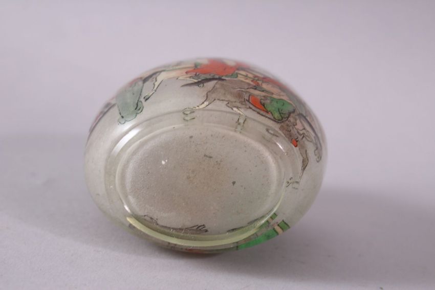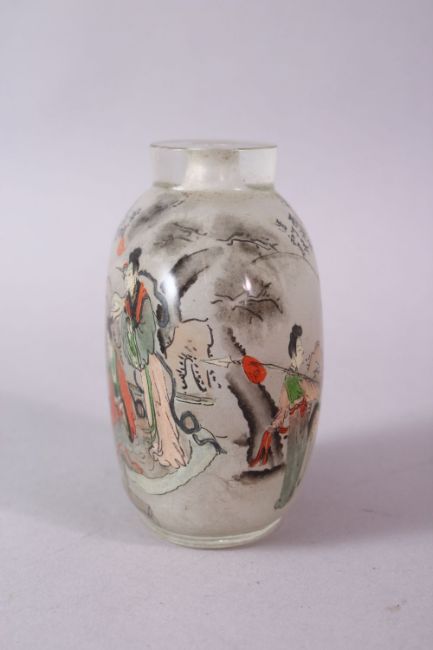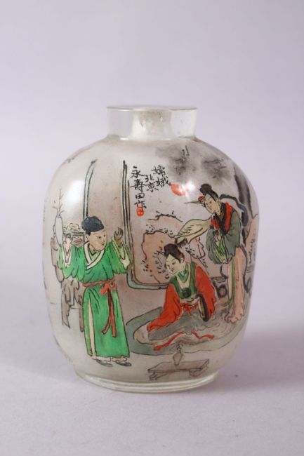 A 19TH CENTURY CHINESE REVERSE PAINTED SNUFF BOTTLE, with many figures and calligrpahy, 9cm high.