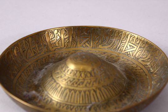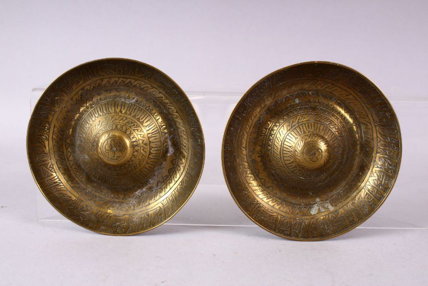 A PAIR OF ISLAMIC MAMLUK REVIVAL DAMASCUS BRASS BOWLS, with raised centres and engraved decoration, 12cm diameter.