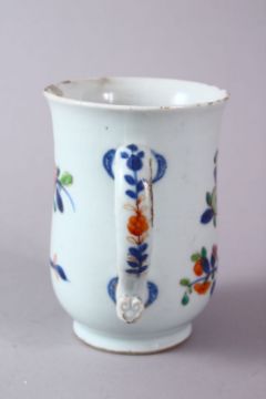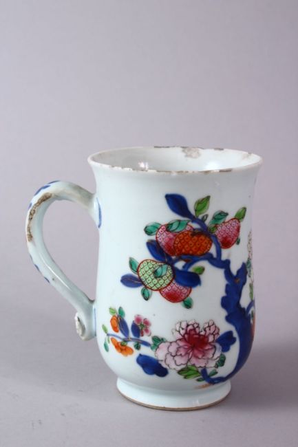 A 18TH/19TH CENTURY CHINESE FAMILLE ROSE FLORAL DECORATED TANKARD, with a ruyi handle, 12.5cm high.