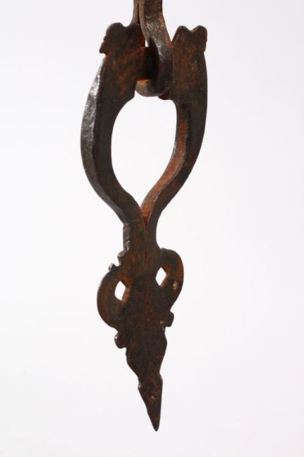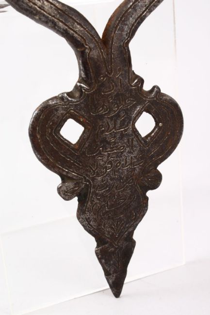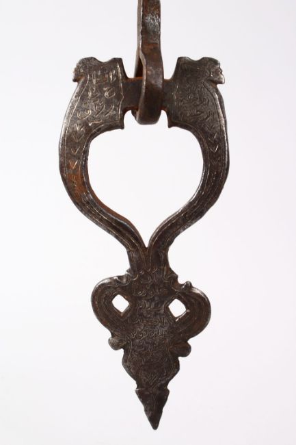 A 17TH / 18TH CENTURY PERSIAN SAFAVID STEEL DOOR KNOCKER, with calligraphy, 24cm.
