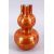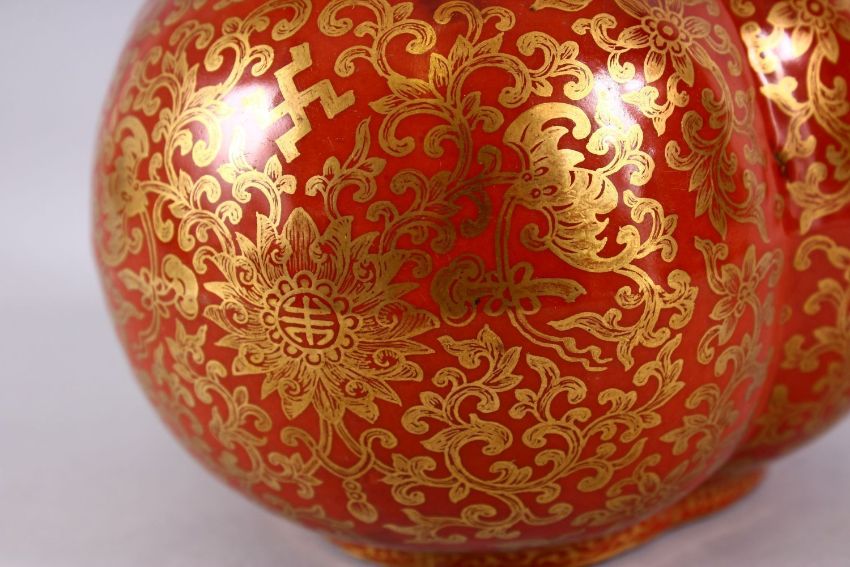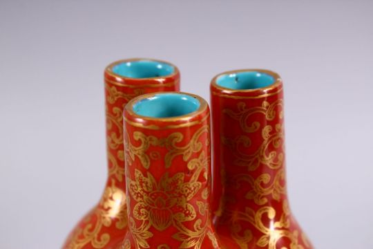 A FINE CHINESE CORAL GROUND TULIP SHAPED PORCELAIN VASE, the body of the tulip / gourd shaped vase with gilt decoration of ruyi borders, formal scroll and flora and swastika motif, the inner neck an base with turquoise ground, and bearing a six character mark, possibly 20th century. 26cm high.