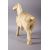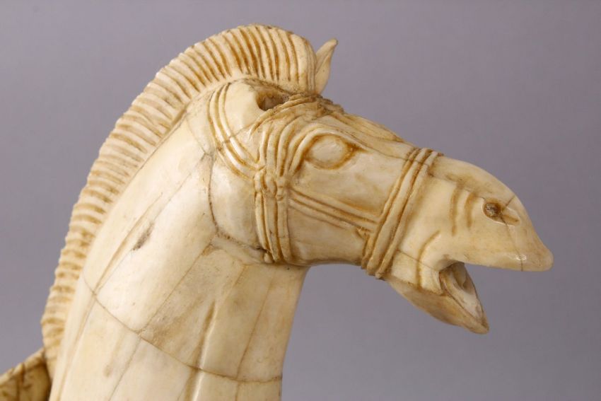 A LARGE 19TH / 20TH CENTURY CHINESE CARVED SECTIONAL BONE FIGURE OF A TANG STYLE HORSE, stood in a striding pose with one foot up, bearing a grin, with carved saddle details and hanging decorations, formed from many carved sections, 32cm high x 32cm wide.