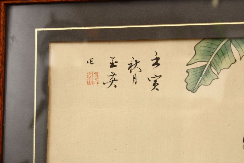 TWO GOOD CHINESE PAINTINGS ON SILK, one painting depicting native flora and butterflies, signed and sealed, 33cm x 42cm, the other picture of a seated Chinese lady in a landscape setting.