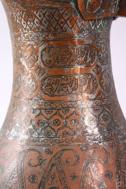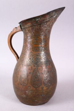 A 19TH CENTURY PERSIAN COPPER JUG, engraved with boteh.