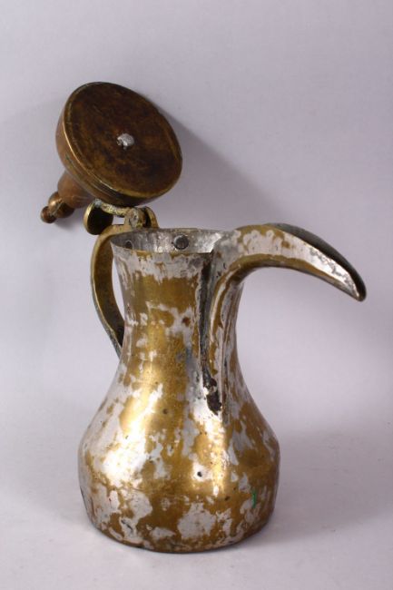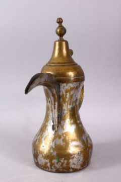 AN 19TH CENTURY ISLAMIC SILVERED BRASS SIGNED DALLAH / COFFEE POT, with an impressed signature to the body, 32cm high x 30cm wide.