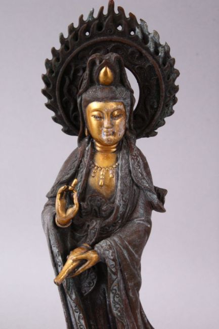 A CHINESE SMALL PART GILT BRONZE STANDING DIETY, 23cm high.