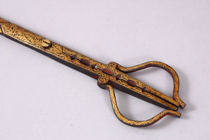 A GOOD SET OF TURKISH ISLAMIC CALLIGRAPHY TOOLS, Comprising a pair of Makta scissors inlaid with gold, 30cm, together with kalemtras, both with carved bone decoration 20cm & 14cm.