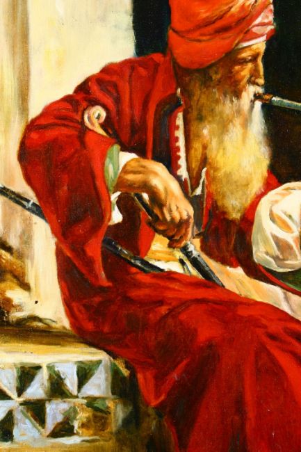 AN ORIENTALIST PAINTING - OIL ON CANVAS OF A SEATED SMOKING MAN, 71CM X 49CM