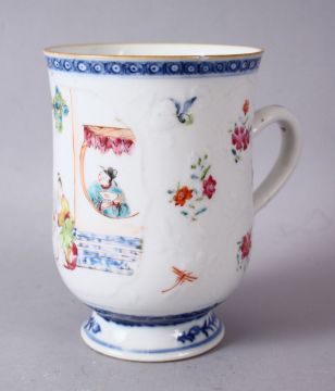 A 18TH / 19TH CENTURY QIANLONG FAMILLE ROSE PORCELAIN CUP, the body slightly moulded with panels of flora and birds, with a larger main panel of figures seated playing games exterior, 13cm high x 9.5cm dia.
