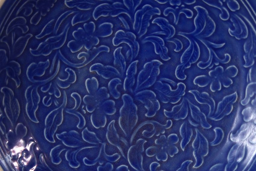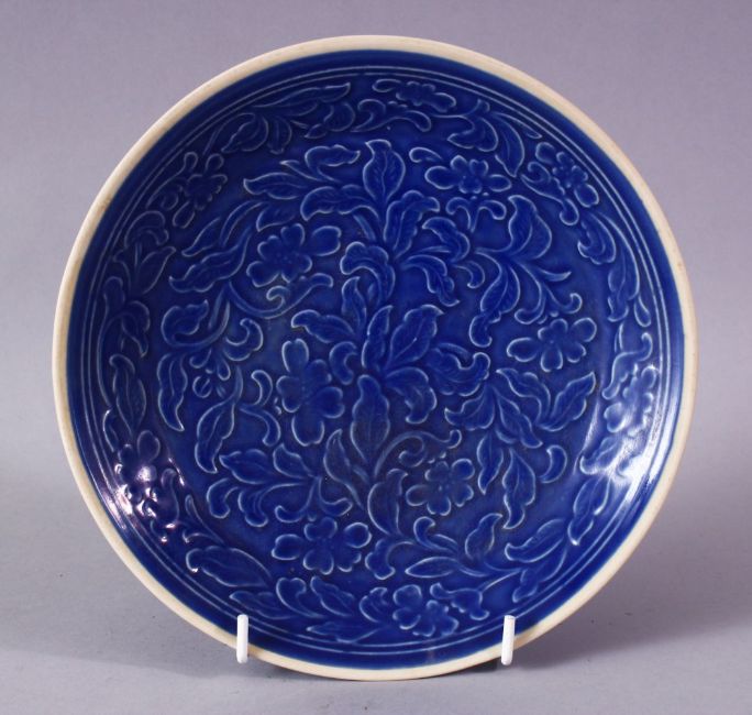 A CHINESE SONG STYLE BLUE GROUND CARVED FLORAL PORCELAIN DISH, 20.5cm