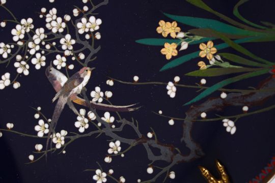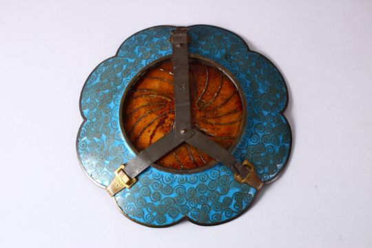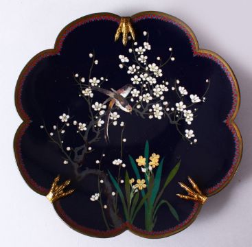 A JAPANESE MEIJI PERIOD SILVER WIRE MOULDED PETAL FORM CLOISONNE DISH, depicting two birds in a cherry blossom tree above iris with a three claw gilt metal hanging, the verso with scrolling wire turquoise ground, 18.5cm diameter.