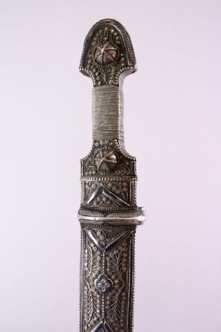 A 19TH CENTURY RUSSIAN KINJAL DAGGER with niello decoration to the scabbard and hilt, 49cm long.