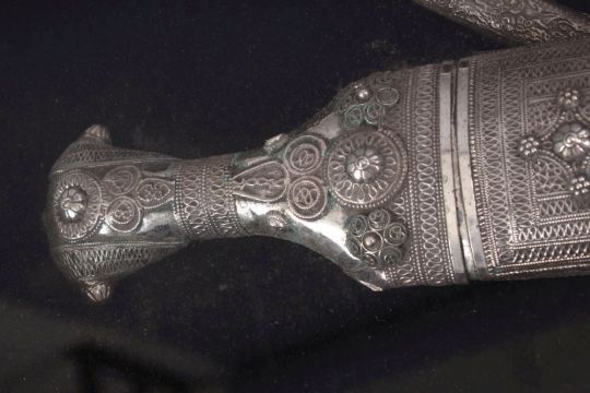 A GOOD 19TH CENTURY TURKISH KINJAL DAGGER IN A FRAME WITH A CAMEL AND OIL POURER, white metal, possibly silver, 57cm high x 41cm wide ( framed )