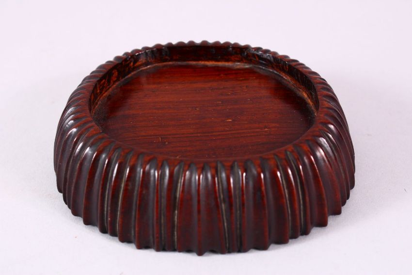 A LOT OF 6 19TH CENTURY CHINESE CARVED HARDWOOD STANDS, each of varying size and shape, three of the unusual formed stands being one piece dense heavy timbers and possibly hongmu or other, the remaining: one of the stands inlaid with silver and one of unusual barrel form, housing vases or objects from 9.3cm down to 4.6cm, once of slightly oval form, 8.5cm x 8cm. (6)