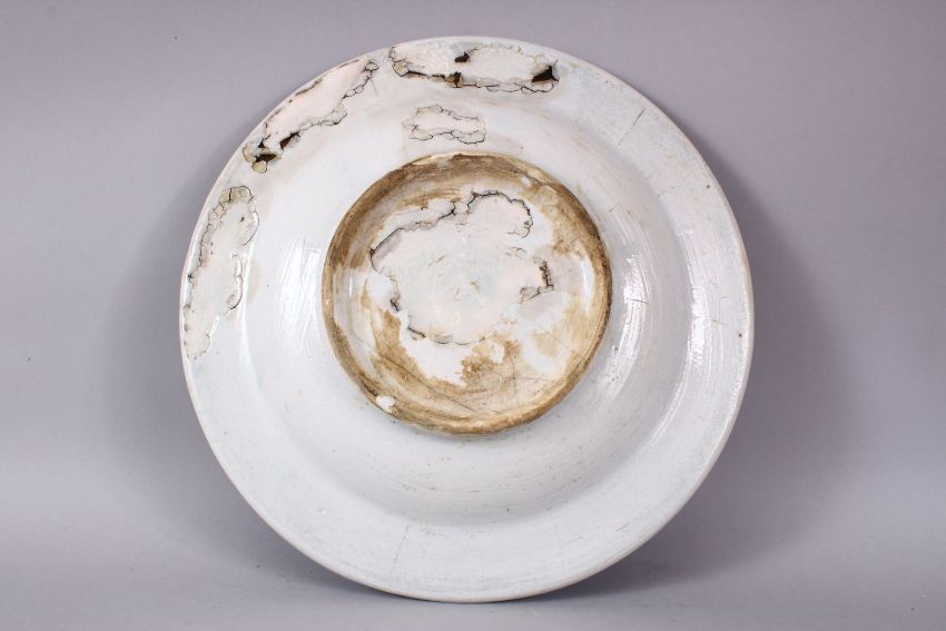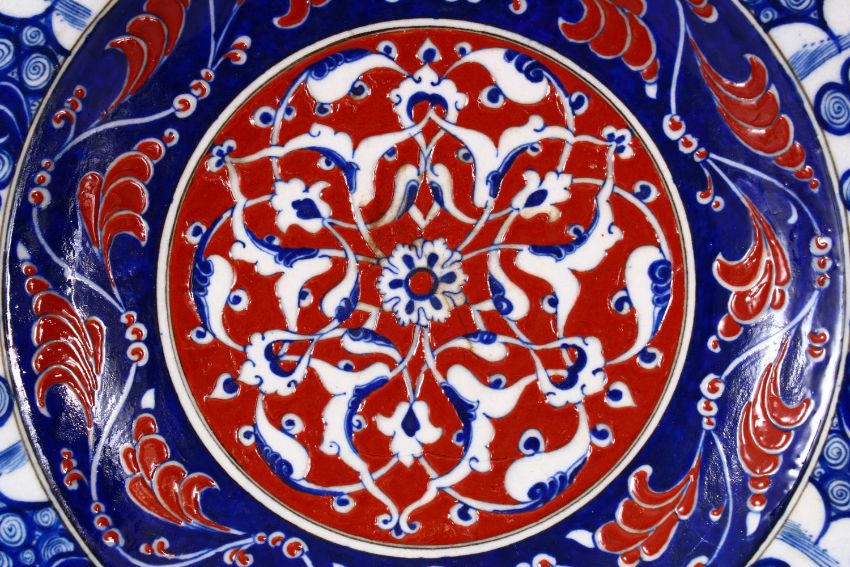 A RARE IZNIK POTTERY PLATE, decorated with blue, white and red decoration depicting stylized floral motifs, 36cm.