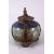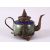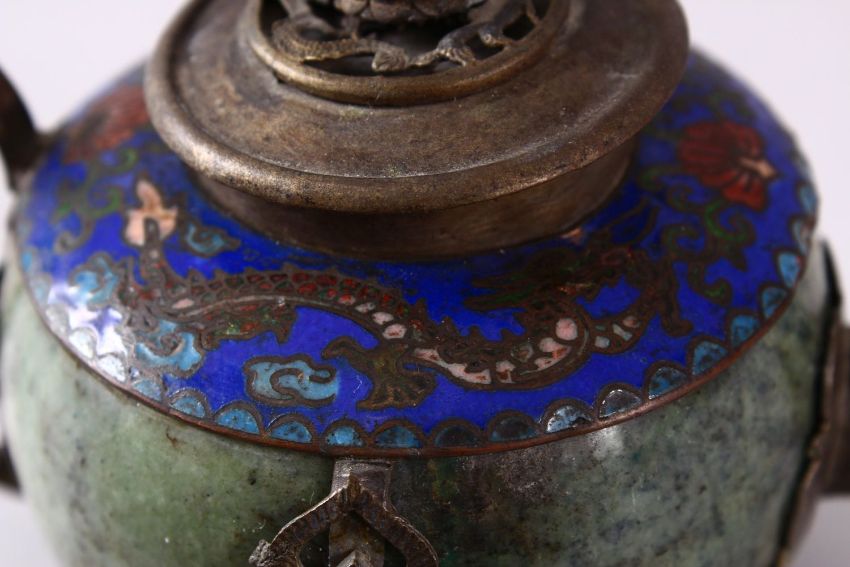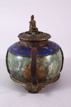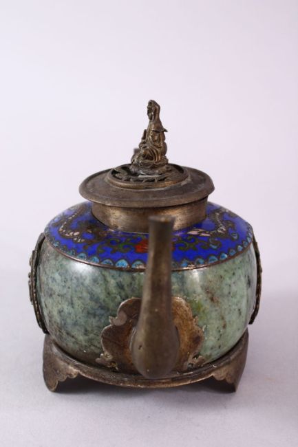 A 19TH CENTURY CHINESE BUDDHIST CARVED JADE / HARDSTONE & CLOISONNE TEAPOT, the body formed from carved jade or hard stone with metal mounts with decoration of guanyin stood upon lotus, with a band to the shoulder of cloisonne depicting dragons and pearls, the cover with a model of guanyin, the base with a four character mark, 8cm high x 14cm wide.