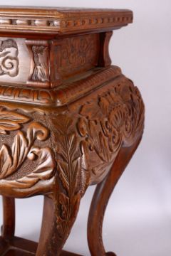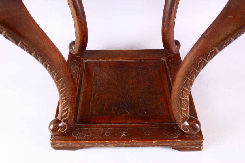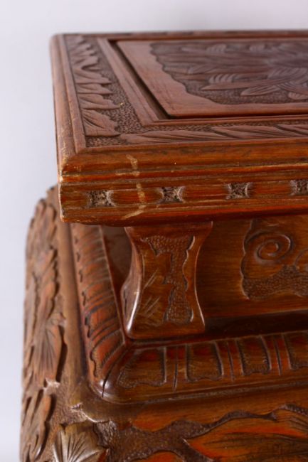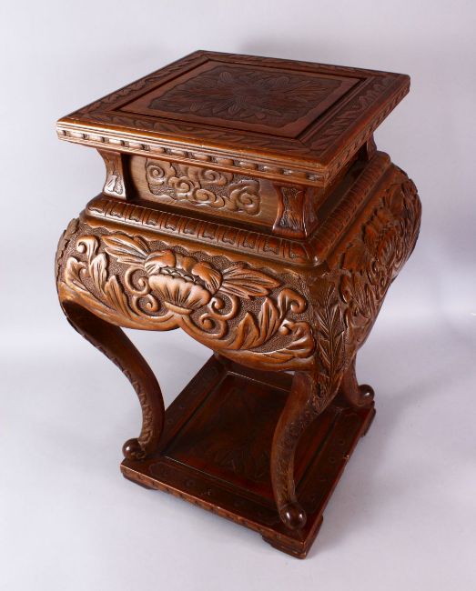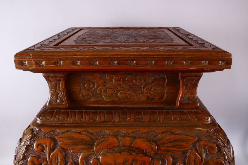 A LARGE JAPANESE MEIJI / TAISHO PERIOD CARVED WOODEN STAND, the top carved with chrysanthemum, the body of the stand carved with borders of floral motif, upon four carved curving legs to a solid square carved base, approx. 70cm high x 44cm wide with a 36cm square top.