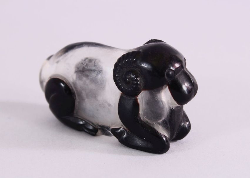A GOOD CHINESE PEKING GLASS SNUFF BOTTLE - RECUMBENT RAM - the ram in a recumbent position , the opening to the rear of the animal, 6.5cm