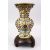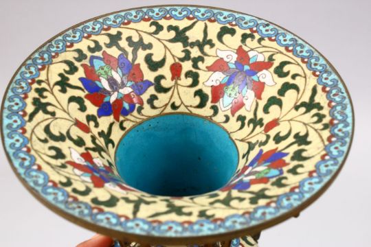A FINE QUALITY 20TH CENTURY CHINESE CLOISONNE VASE, the vase with a pale yellow ground with formal flora design, with gilt metal moulded decoration, on a fitted hardwood stand, 25.5cm high x 15cm wide.