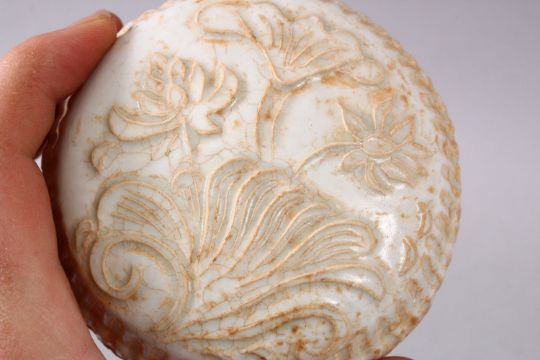 A CHINESE SONG STYLE POTTERY BOX AND COVER, decorated with raised flora and lotus, with a ribbed body, 10cm
