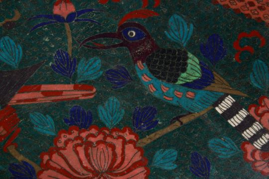 A LARGE 19TH CENTURY ORIENTAL CLOISONNE CHARGER, with tri-sectional decoration of birds and flora, 60cm diameter.