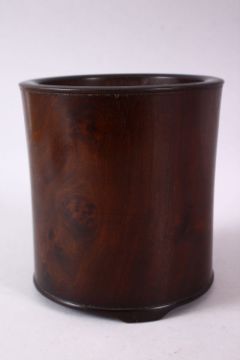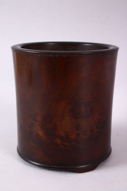 A CHINESE BURR WOOD BRUSH POT, of plain design, on three bracket feet, 16cm high.