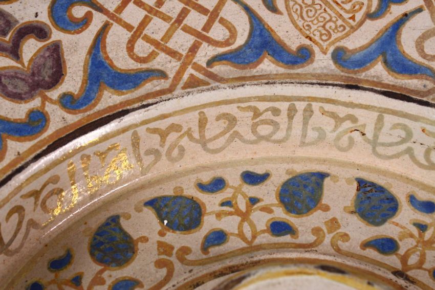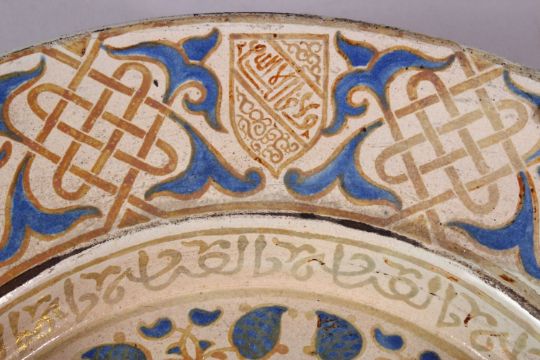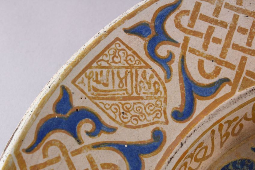 A GOOD LARGE EARLY ISLAMIC HISPANO MORESQUE LUSTRE DECORATED WATER BASIN, with a central stepped, raised ewer stand, surrounded with painted stylised leaves, the broad rim painted alternately shield shape emblems, latticework and leaves with calligraphy, 47cm diameter.