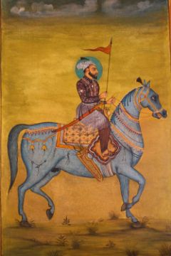 A FINE INDIAN SIKH SCHOOL MINIATURE PAINTING OF A NOBLEMAN - the noble man depicted seated upon horseback in a landscape, 31cm x 22.5cm