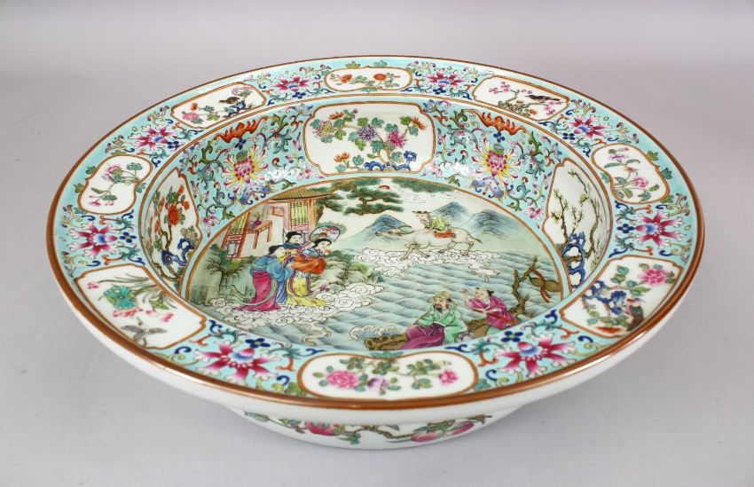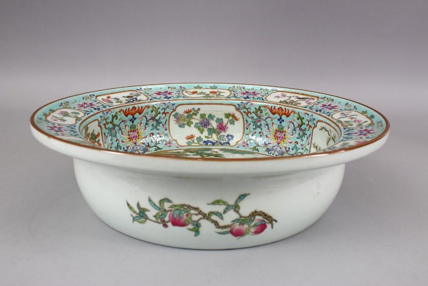 A LARGE CHINESE FAMILLE ROSE PORCELAIN BASIN, with panel decoration, of native floral decoration and a main panel of figures amongst landscapes and upon animals, the exterior with decoration of peaches and other fruits, 36cm diameter.