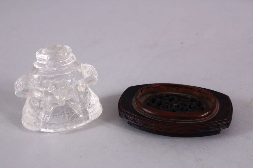 AN 18TH CENTURY CHINESE CARVED ROCK CRYSTAL VASE AND COVER, with rams head and ring handles, with floral carved lower, geometric key design, with its carved hardwood base, with ex christie's labels & provenance, 25cm high 8.5cm.