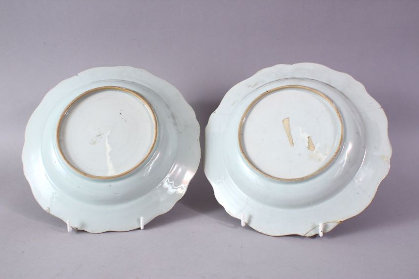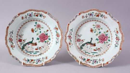 A PAIR OF 18TH CENTURY CHINESE FAMILLE ROSE CIRCULAR PLATES, painted with flowers and peacocks, 23cm diameter.