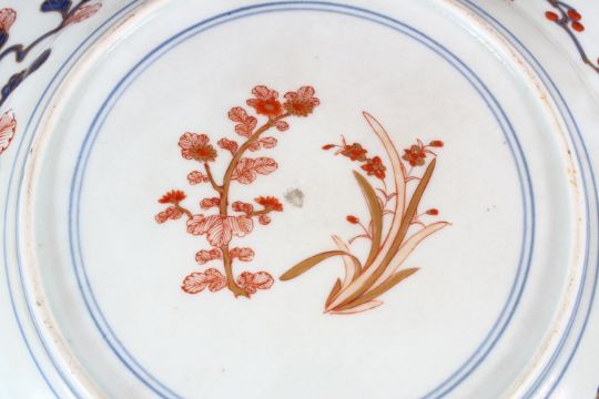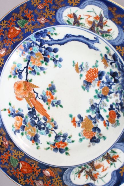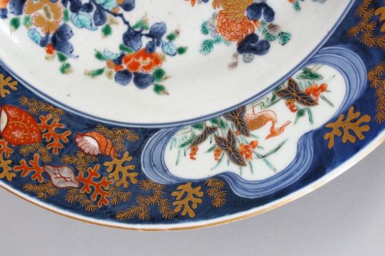 A FINE EARLY 19TH CENTURY JAPANESE IMARI PORCELAIN CHARGER, central decoration of a bird upon a tree branch, with floral spray, the border with finely enameled shell decoration with birds and flora, the underside with chrysanthemum decoration with gilt highlights, 40cm diameter