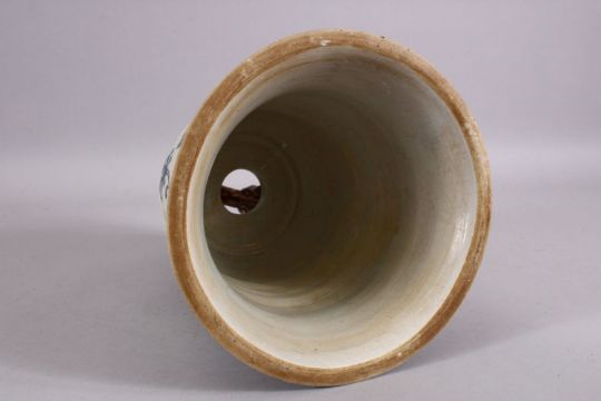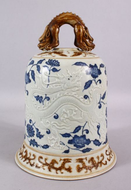 A CHINESE BLUE, WHITE & BISCUIT MING STYLE DRAGON PORCELAIN TEMPLE BELL, the body with moulded relief dragons with blue underglaze lotus decoration, with a biscuit glazed mythical beast handle, 27cm high x 19cm diameter.