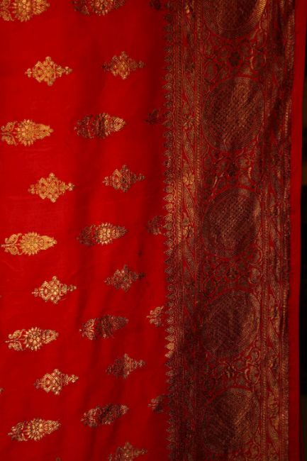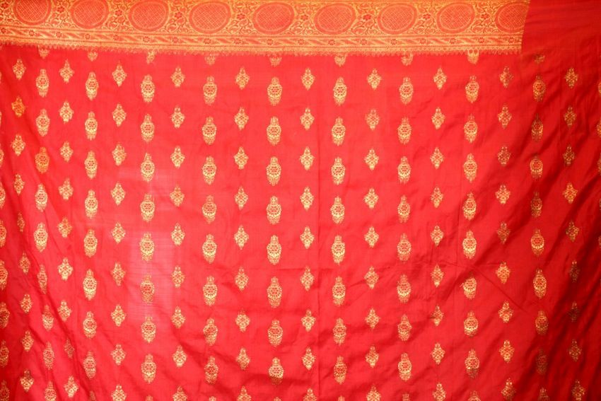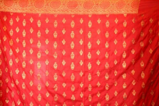 A VERY FINE 19TH CENTURY INDIAN GOLD INLAID SILK TEXTILE, with fine gold embroidery with motif decoration.