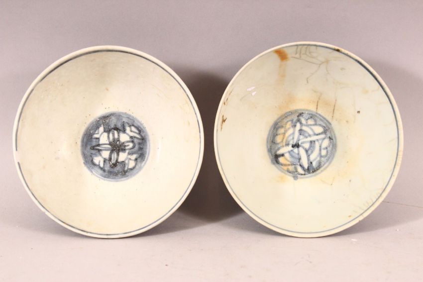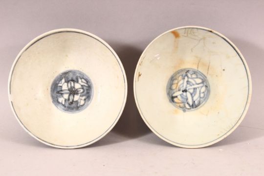 A PAIR OF CHINESE WANLI PERIOD BLUE & WHITE SHIPWRECK PORCELAIN BOWLS.